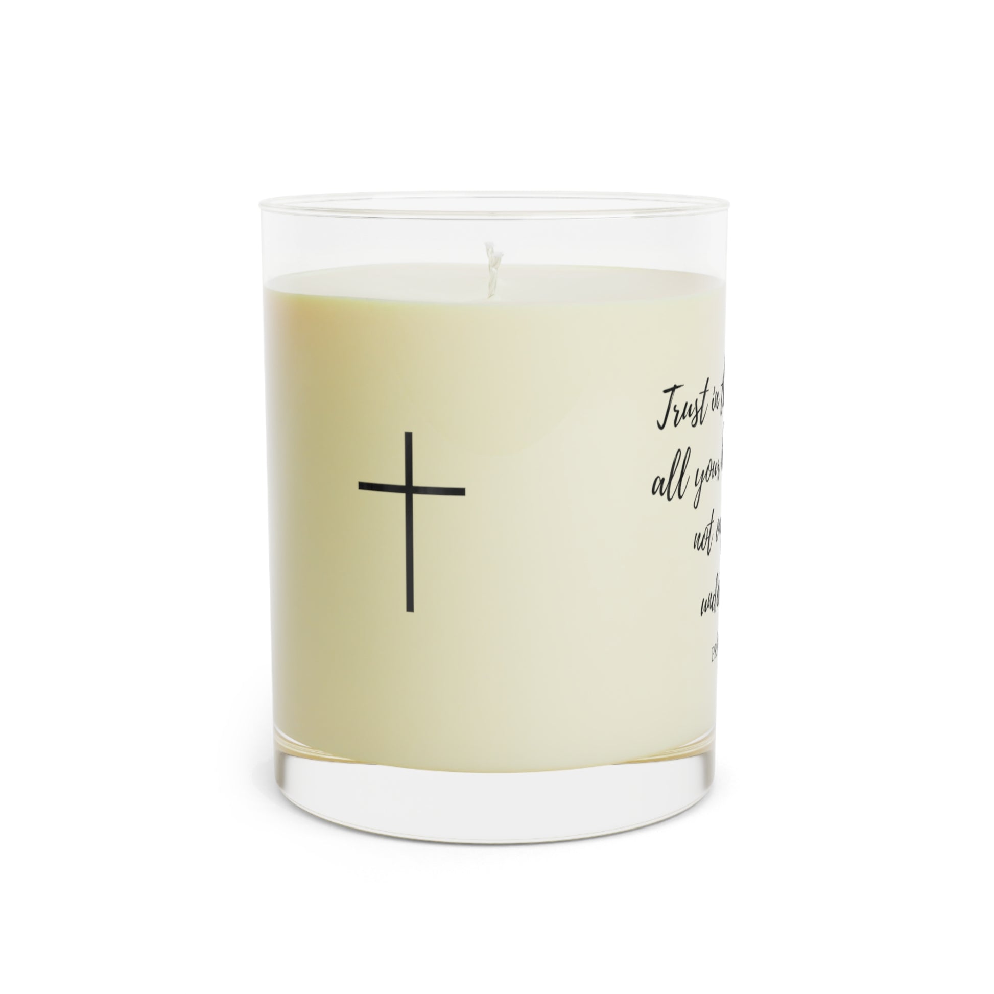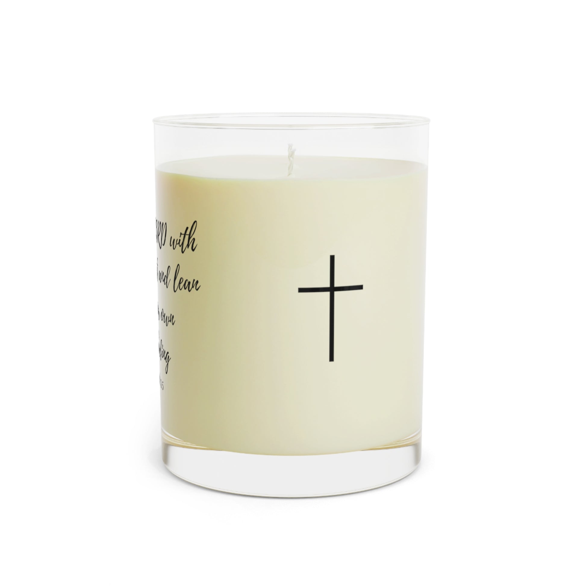 A hand-poured soy wax candle wrapped in a full-glass 360° print that brings quiet warmth and gentle light to evenings of reflection. Two cotton-cored wicks produce an even, clean burn while the fragrant blend—choose from White Tea & Fig, Lavender & Sage, or Ocean Mist & Moss—fills a room without overpowering it. The glass vessel’s vibrant print showcases an elegant script and scripture accent (John 8:12), creating a calm focal point on a bedside table, mantel, or prayer corner. After the last melt, the glass can be washed and repurposed as a votive holder or small vase, and the simple cardboard lid keeps dust away between uses. Assembled in the USA from globally sourced parts and made with 100% food-grade soy wax, this candle offers a sustainable, clean-burning way to bring scent and serenity into everyday spaces.